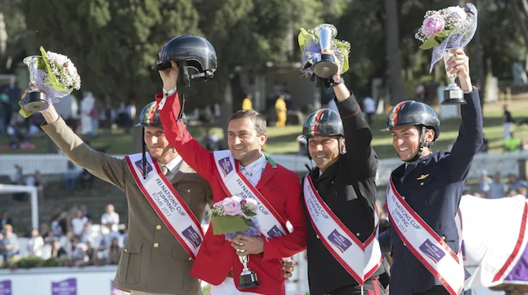 Quelle démonstration de cœur, de style et de force! Cet après-midi à Rome, la Squadra Azzurra a mis fin à trente-deux ans de disette sur son enchanteresse Piazza di Siena, où le l’Officiel d’Italie se tient depuis des lustres. C’est dire si le public romain attendait ça avec espoir et fébrilité! Au terme de deux manches d’une passionnante Coupe des nations Longines, disputée sous un soleil de plomb et devant un public plus nombreux que ces dernières années, la fière équipe d’Italie a validé une victoire certes un peu attendue, mais amplement méritée et célébrée comme il se doit lors d’une émouvante remise des prix et d’une conférence de presse complètement foutraque!