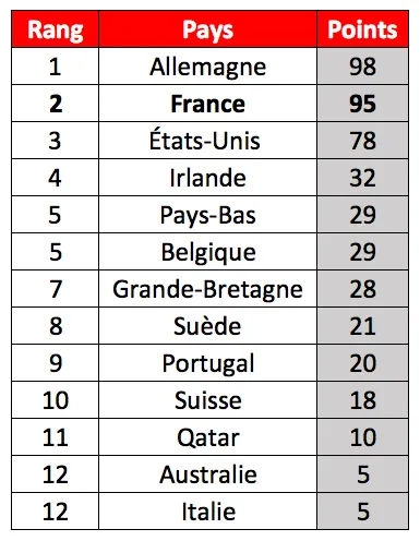Au terme du calcul, c'est finalement l'Allemagne qui apparaît en tête du classement. Si nos voisins d'outre-Rhin ne peuvent compter qu'un seul cavalier dans le top dix, Christian Ahlmann, deuxième mondial, c'est chez eux que l'on retrouve le plus de pilotes dans le top trente (six). Avec un total de quatre-vingt-dix-huit points, les Allemands mènent donc la danse mais de peu puisque les Tricolores, moins nombreux mais plus performants au classement mondial, les talonnent avec quatre-vingt-quinze points. Un joli total réalisé grâce à Simon Delestre, Pénélope Leprevost et Kevin Staut, mais également Patrice Delaveau, quinzième meilleur cavalier au monde. Sur la troisième marche du podium, les Américains, que l'on a tendance à oublier car ils évoluent en majorité sur leur continent, sont tout de même vingt points derrière l'Allemagne. On compte quatre cavaliers étasuniens dans le top trente.