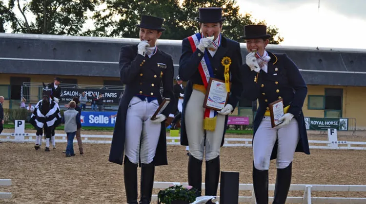 La tension est alors montée d’un cran autour de la carrière d’honneur lorsque [Claire Gosselin] et [Karamel de Lauture] sont entrés en piste. Les représentants tricolores aux derniers championnats d’Europe de Herning, ont déroulé un bon travail au trot malgré un piaffer encore très timide. Un peu moins brillant que la veille, Karamel fait une faute dans les temps qui n’empêche pas sa cavalière de sortir de piste avec une moyenne de 73,400%, ne lançant pas le droit à l’erreur à ses concurrentes. Deuxième depuis le début des festivités, [Catherine Henriquet] a déroulé la reprise de championnat idéale. Calme et à l’écoute, [Paradieszauber] ne commet aucune faute et permet à sa cavalière d’obtenir une moyenne de 74,375%. A son entrée en piste, [Julia Chevanne] sait donc qu’elle n’a pas le droit à l’erreur. Impérial depuis le premier jour, Luciano 182 semble être le cheval le moins touché par la fatigue. Et pourtant, le couple va commettre la faute de trop sur les deux temps, ainsi que quelques petits accrochages, qui lui coûtent la médaille d’or. Avec une moyenne de 73,500%, Julia décroche donc la médaille d’argent avec un total de 213,847 points. « Je suis partie un peu trop vite au début de mon travail au trot car j’avais peur d’être en retard, mais finalement je me suis retrouvée en avance tout au long de ma reprise », souligne Julia Chevanne. « Je ne pouvais pas le ralentir plus pour essayer de me retrouver à nouveau dans le bon tempo, mais j’ai surtout fait trop de fautes et je ne pouvais pas me le permettre. Je vais maintenant digérer ma deuxième déception du week-end », confie celle qui n’a pas pu concourir jusqu’au bout dans le championnat des sept ans, après son abandon avec Swing de Hus le premier jour. Le couple partait pourtant favori au titre de champion de France. Après une saison en dent de scie, Catherine Henriquet s’impose donc pour la première fois en Pro Elite avec Paradieszauber, avec un total de 214,298 points. « Je suis vraiment très contente et Paradieszauber a été très constant tout au long du championnat. Je l’ai monté la nuque un peu plus haute et à la fois plus libre devant. Il était très léger et j’étais moi-même un peu plus cambrée alors qu’habituellement je suis un peu penchée en arrière lorsqu’il veut se sauver vers l’avant. J’étais plus avec lui. Cette Libre a été extraordinaire à monter mais je ne pensais pas gagner », sourit celle qui succède donc à [Jessica Michel] et [Riwera] de Hus. Comme les deux premiers jours, Claire et Karamel sont troisièmes de l'épreuve et montent donc sur la troisième marche du podium.