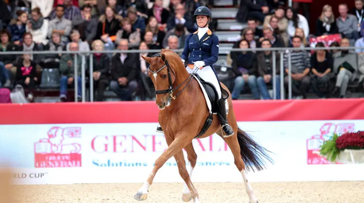 Malchanceuse à Londres, la Suédoise [Mina Telde] a su présenter Santana sous son meilleur jour en sortant de piste avec une moyenne de 76,350% après une reprise très dynamique. Deuxième la veille dans le Grand Prix, [Edward Gal] aura une fois de plus fait preuve de tout son talent en décrochant une moyenne générale de 79,125% avec Glock’s [Undercover]. Le Néerlandais pointera au final à la cinquième place derrière Patrik Kittel en selle sur Watermill [Scandic]. Très impressionnant dans son travail au passage et piaffer, le couple suédois, quatorzième à Londres, restera une fois de plus aux pieds du podium avec une note de 81,025%. Ce sont donc trois cavalières qui se sont emparées complètement du podium de cette étape lyonnaise de la Coupe du monde, comme l’année dernière. Sur sa traditionnelle reprise libre, [Adelinde Cornelissen] a déroulé une reprise techniquement et artistiquement parfaitement maitrisée. La tenante du titre parviendra même à dépasser les 89%, synonyme de record personnel avec Parzvial. « C’est toujours très agréable d’avoir le sentiment de se rapprocher encore un peu plus des 90% », souriait Adelinde. « Parzival est de plus en plus relâché en épreuve et je suis contente que le travail que j'ai fait ces derniers mois sur la décontraction, la souplesse et le soutien, soit apprécié de la part des juges et du public », poursuivait-elle. Elle aussi en piste avec une reprise maintenant bien connue, déroulée sur un thème très italien, [Valentina Truppa] aura su combler les juges pour grimper sur la deuxième marche du podium avec une moyenne de 83,350%. « J’aime beaucoup les reprises en musique et Eremo était comme souvent plus décontracté que sur le Grand Prix ». Médaillée d’argent par équipe aux Jeux olympiques de Londres, [Kristina Sprehe] complète ce podium féminin en selle sur Desperados. La jeune cavalière allemande de vingt-six ans a su repartir sur le bon pied après les quelques soucis auxquels elle a dû faire face dans le Grand Prix. Le couple sort donc de piste avec une moyenne de 82,250% suffisante pour lui assurer le podium pour sa première sortie depuis les Jeux.