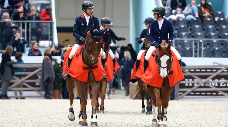 Après des résultats en demi-teinte les deux premiers jours, les deux jeunes pilotes tricolores, chaperonnés par Simon Delestre, ont été irréprochables en cet fin de matinée sous la verrière du Grand Palais. En sortie de piste, Margaux Rocuet a laissé éclaté sa joie et a chaleureusement félicité son meilleur cheval Trafalgar Kervec. Kevin Gauthier voit avec cette victoire s’accomplir plusieurs années de travail, puisque sa monture, l’alezan de onze ans Twist de la Butte, n’est autre qu’un hongre qu’il a acheté poulain, débourré, puis amené lui-même au plus haut niveau. Seuls couples à aligner deux doubles sans faute sur les barres, les Français ont décroché la victoire haut la main devant l’équipe néerlandaise composée de Teddy van de Rijt en selle Itcho van’t Ruytershofsur, auteur d’un parcours à quatre points en première manche, et Iris Hakvoort juchée sur le bon Don’t Tell Me What To Do, sans faute dans les deux manches. Les Suédoises Karin Martinsen et Evelina Tovek complètent le podium de cette finale. Karin Martinsen associée à Stenhaga Tulip Tattoo a fauté à deux reprises dans la première manche, tandis que Evelina Tovek, victorieuse dans l’épreuve d’ouverture vendredi et deuxième de la finale l’an dernier, a pu compter sur son étalon de dix ans Mill’s Sheridan pour réaliser deux parcours vierges parfaitement maitrisés.