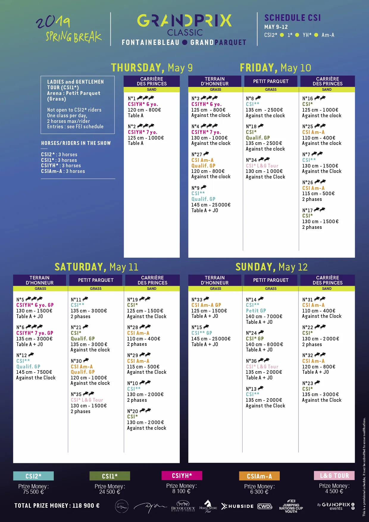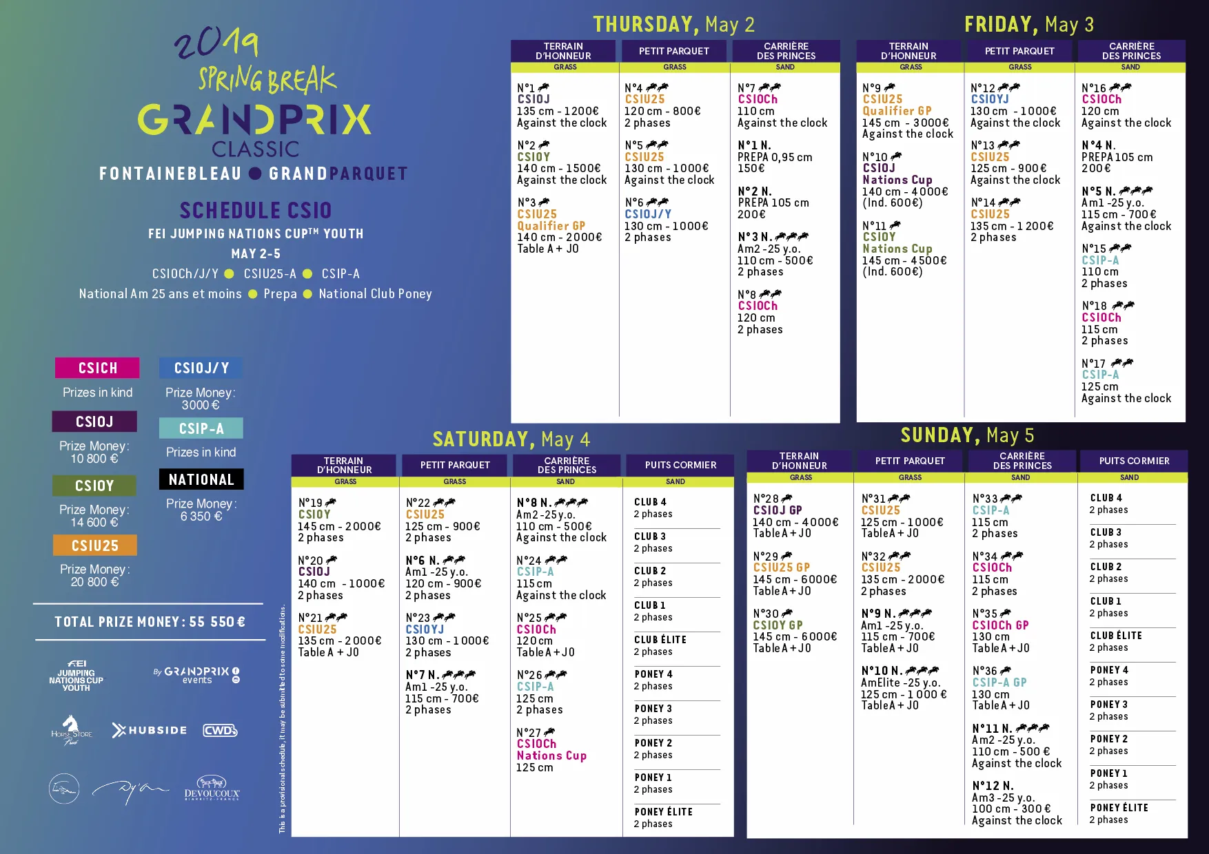 Parmi les temps forts de la compétition, les cavaliers Juniors et Jeunes Cavaliers s’élanceront sur le Terrain d’Honneur le vendredi 3 mai à l’occasion de la Coupe des nations, tandis que celle des Enfants aura lieu sur la même piste le lendemain. Les Grands Prix se tiendront quant à eux tous trois le dimanche.