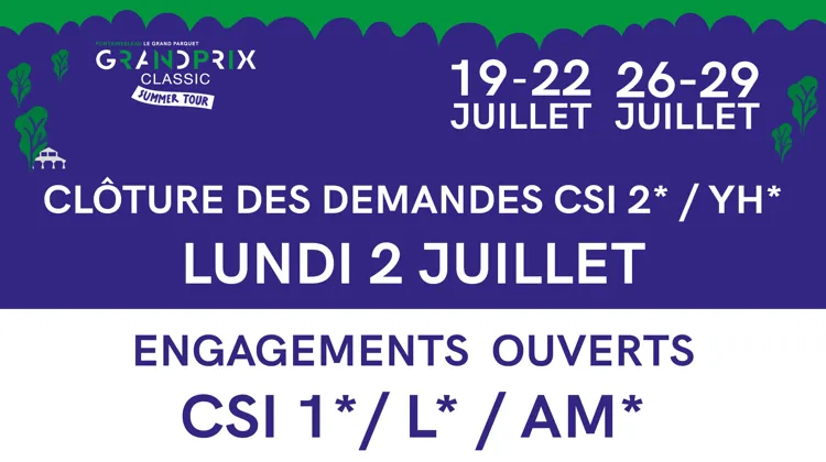 Vous pouvez dès aujourd’hui envoyer vos demandes de participation pour le CSI** et CSI YH du deuxième weekend du GRANDPRIX CLASSIC Summer Tour, jusqu’à la clôture des demandes le 9 juillet.Les engagements pour les CSI 1*, CSI Amateurs* et CSI Ladies* sont également ouverts !