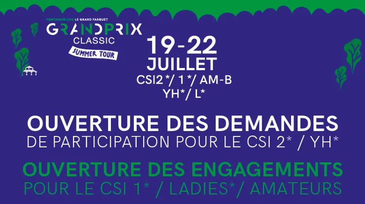 Dès aujourd’hui, vous pouvez également engager pour le CSI 1*, le CSI Amateurs*, mais également – seulement pour ces dames – dans le CSI Ladies* qui se tiendront du 19 au 22 juillet. Vous avez jusqu’au 9 juillet !Pour connaitre le détail du programme, rendez-vous sur GRANDPRIX-CLASSIC.com.