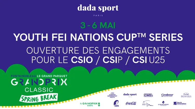 Plus que quinze jours avant le Spring Break de GRANDPRIX CLASSIC au Grand Parquet de Fontainebleau. Du 3 au 6 mai, le rendez-vous est donné pour l’étape française des YOUTH FEI NATIONS CUP SERIES présentée par Dada Sport, un CSIP et un CSI U25. Rendez-vous également du 10 au 13 pour un CSI présenté par Cavalassur !