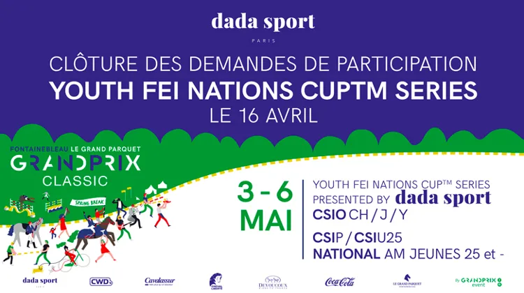 Si les demandes de participation sont toujours ouvertes pour l’étape française des YOUH FEI NATIONS CUP SERIES présentée par Dada Sport, vous n’avez plus que jusqu’à lundi prochain, le 16 avril, pour faire vos demandes de participation. Après, cela sera malheureusement trop tard…Pour le CSIP et le CSI U25, c’est la même date limite, alors ne tardez pas non plus.