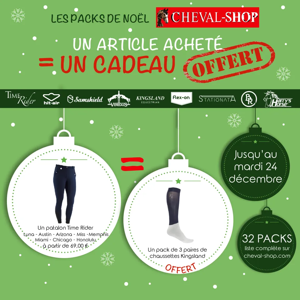 * Offre valable jusqu’au 24 décembre 2019, dans vos boutiques Cheval-Shop selon dates et horaires d’ouverture, sur www.cheval-shop.com et sur le Salon du Cheval de Paris. Valable selon les stocks disponibles en magasin, photos et coloris des cadeaux non contractuels. Cadeaux non modifiables, non échangeables, non remboursables, non cumulables avec le programme fidélité. Offre valable une seule fois par foyer. Non valable sur les commandes et les promotions en cours. Liste complète des packs disponible sur www.cheval-shop.com.