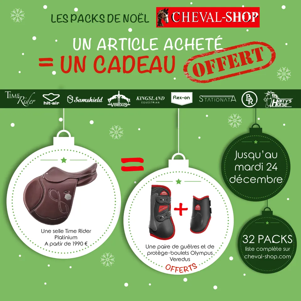 En panne d’idées cadeaux ? Ou simplement envie de se faire plaisir ? Cheval-Shop vous gâte jusqu’à Noël. Pensés pour tous les porte-monnaie, pour les chevaux comme pour les cavaliers, les packs Cheval-Shop sont accessibles à tous.