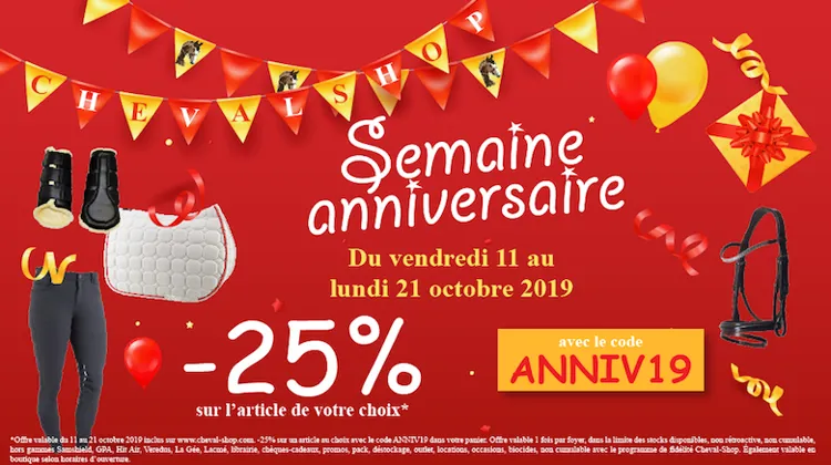 *Offre valable du 11 au 21 octobre 2019 sur www.cheval-shop.com. 25% de remise sur un article au choix avec le code ANNIV19 dans votre panier. Offre non cumulable, non rétroactive, valable 1 fois par foyer, dans la limite des stocks disponibles, non valable sur les gammes Samshield, GPA, Hit Air, Veredus, Lacmé promos, outlet, librairie, La Gée, locations, réparations, occasions, biocides, non cumulable avec le programme de fidélité Cheval-Shop. Également en boutique selon horaires d'ouverture.