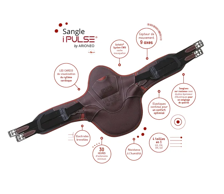 Grâce à sa conception 4 tailles en 1 (125, 130, 135, 140 cm), la sangle bavette iPulse® s’adapte à la morphologie de chaque cheval. La souplesse du cuir tanné végétal apporte un confort optimal tandis que les élastiques continus et le design diminuent la pression. Des électrodes brevetées permettant le suivi physiologique du cheval à l’effort.