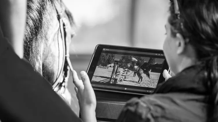 En Stage : Le cavalier visionne ses sessions en compagnie de son entraîneur comme lors d’un stage.
