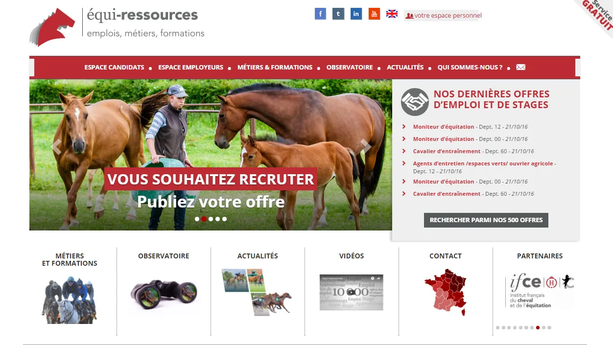 À l’occasion de ses dix ans, le site dédié à l’emploi et à la formation au sein de la filière équine fait peau neuve ! Créé en partenariat avec l’Ifce, la Région Normandie, le Conseil des chevaux de Normandie, le pôle de compétitivité Hippolia et le Pôle emploi, équi-ressources accompagne les recruteurs et les candidats en recherche d’emploi dans le domaine équestre depuis 2007. La mission d’équi-ressources ne s’arrête pourtant pas là. Au fil du temps, le service s’est développé pour devenir aujourd’hui, au sein de la filière, le principal indicateur de tendance concernant l’adéquation emploi-formation et le référent en matière d’orientation.