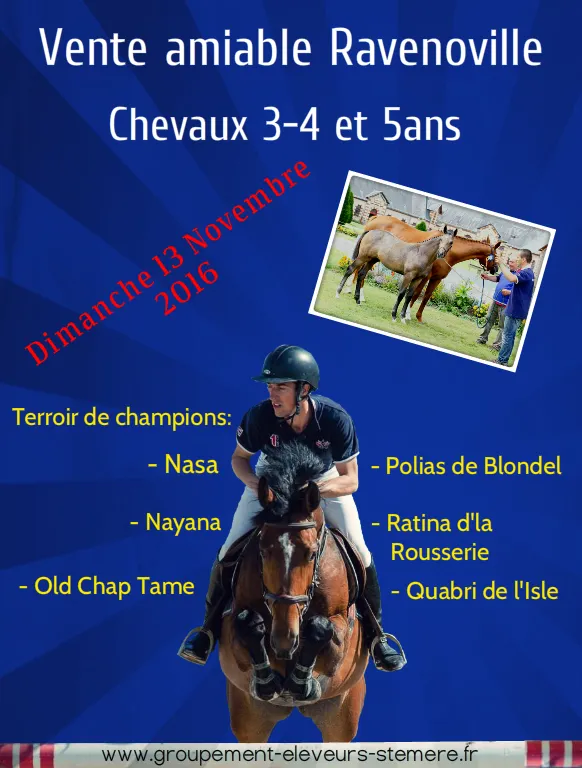 Dimanche 13 novembre, dans le cadre fonctionnel du Centre de Valorisation de Ravenoville (Manche), le Groupement des Éleveurs de chevaux de la région de Sainte-Mère-Église organise une vente amiable de chevaux de sport sélectionnés, âgés de 3 à 5 ans. Issus de pères performers – Urano de Cartigny, Untouchable M, Old Chap Tame, Air Jordan, etc. – et de quelques-unes des meilleures lignées maternelles normandes, ces 30 sujets seront présentés à l’obstacle et pourront être essayés sur place.