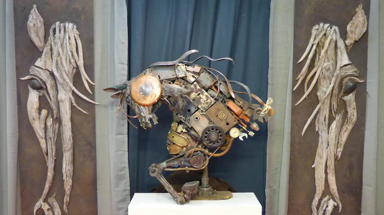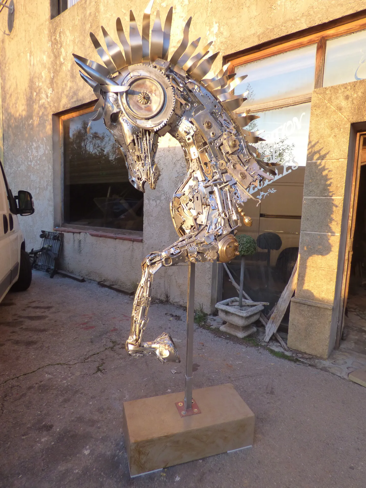 Le processus de création diffère lui aussi. “J’essaie de commencer par un dessin car les gens veulent voir comment une telle œuvre peut rendre, mais ce n’est qu’une ébauche. Lors de la création, en tournant une pièce, on peut en effet s’apercevoir qu’elle irait mieux ici ou là. Le métal a une histoire forcément associée à l’humain. Ce n’est donc ni le même travail, ni la même énergie que le bois flotté.“ À ce titre, il n’est donc pas rare pour le spectateur, même non bricoleur, de reconnaître l’origine des matériaux utilisés. “Actuellement, je travaille des pièces de voiture“, précise Frédéric. Le Provençal navigue donc d’un matériau à l’autre au gré de ses inspirations et de ce qu’il a sous la main. “Avec le bois flotté, nous sommes parfois coincés car il nous manque le bon morceau. Nous commençons aussi à associer bois et métal. Ce mélange donne naissance à une sorte de cheval robot avec un côté savant fou. Il faut du changement de temps en temps, sinon il n’y a plus de plaisir“, sourit-il.