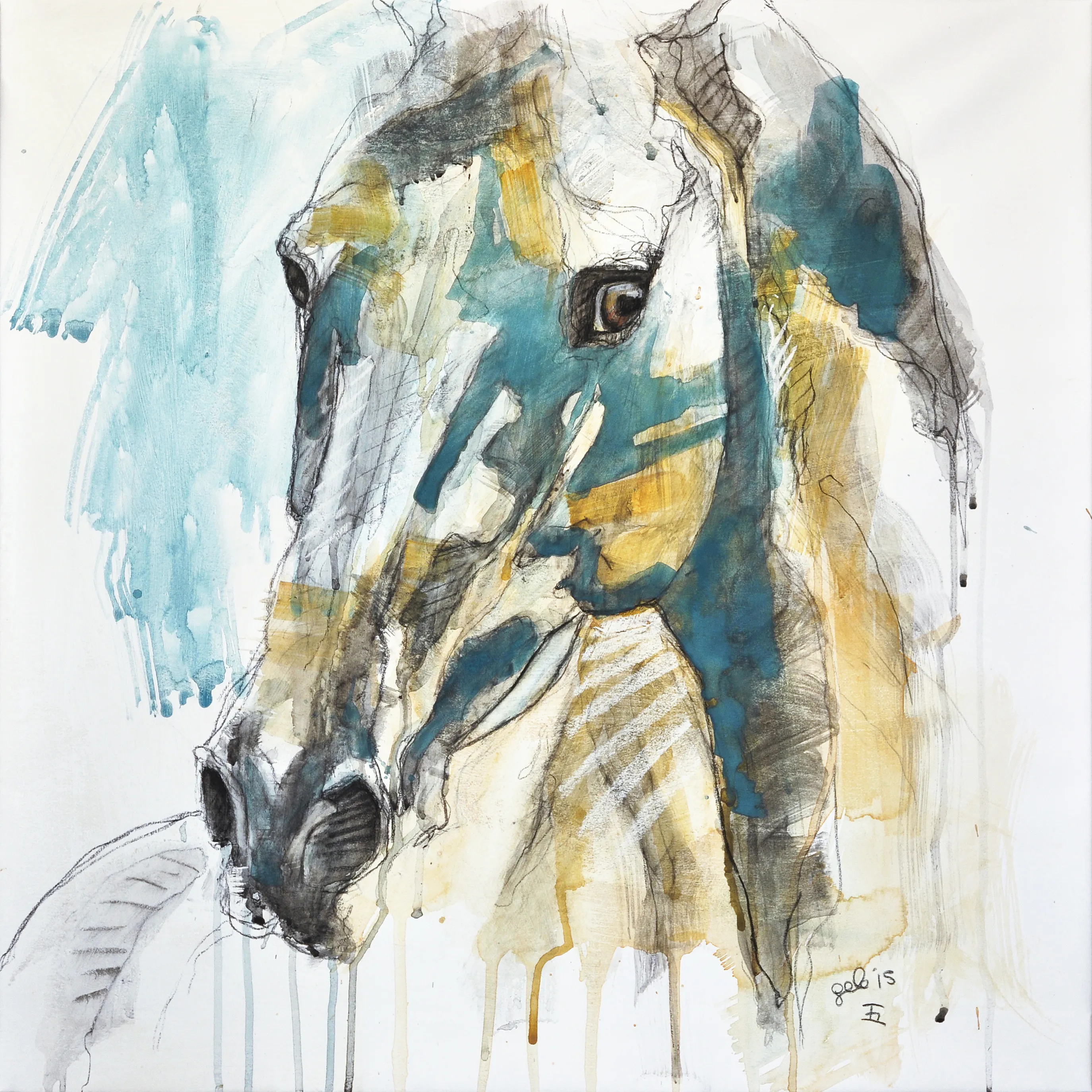 Si son travail évolue aujourd’hui encore, Bénédicte Gelé met résolument son art au service du cheval et de son expression. “Je ne suis pas monotechnique, je suis une touche à tout“, précise la Francilienne. Après avoir privilégié la peinture à l’huile, la peintre s’est ainsi mise à l’aquarelle, à l’acrylique puis au fusain. “Finalement, j’ai fini par tout mélanger : l’aquarelle avec le pastel et la craie noire. Cette dernière est encore plus noire que le fusain, et elle est aujourd’hui la base de mon travail pour dessiner les lignes, qui restent au cœur de mes œuvres. En ce moment, j’utilise beaucoup l’acrylique, très diluée, qui peut se rapprocher de l’aquarelle. Je travaille par couches de peinture très transparentes, ce qui ajoute une profondeur à l’œuvre. C’est une technique assez riche car la couche inférieure reste présente.“