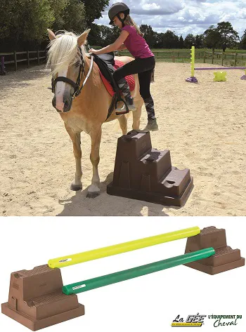 LE MONTOIR-CAVALETTI EASY STEP , Un marche pied 2 en 1 ! : Il peut s'utiliser comme un cavaletti car il dispose de nombreux supports de barre Ø 80 mm ou 100 mm sur son pourtour. Il permet ainsi de créer de petits obstacles de travail. Il séduira à coût sûr les jeunes cavaliers avides de premières sensations en saut d’obstacles.Ou bien, il peut servir de montoir pour faciliter l’accès du cavalier à sa monture tout en soulageant le cheval. Très apprécié des jeunes cavaliers en période d’apprentissage.