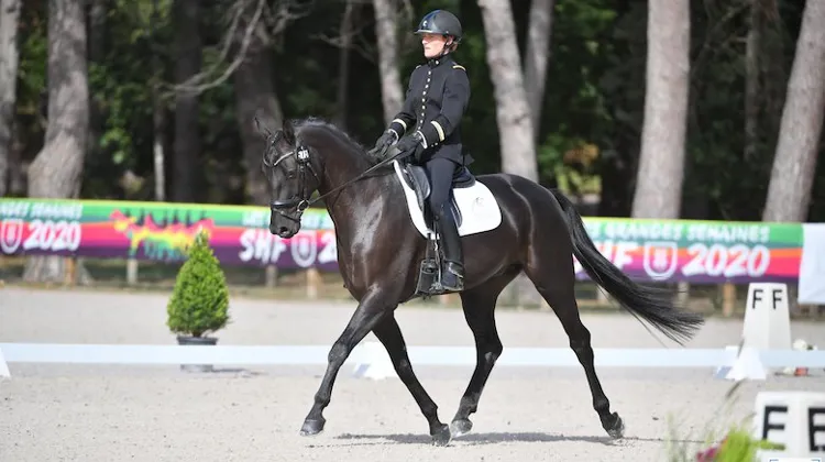 Je suis assez contente de mon cheval. D’autant plus que l’année dernière il n’est pas sorti, il est même rentré du pré en juin 2019. Cela fait donc à peu près un an qu’il est vraiment au travail. Avec lui, on y est vraiment allé doucement car il est encore en train de grandir. Les juges l’ont vu d’ailleurs ce week-end : ils m’ont dit qu’il avait encore la croupe haute. C’est sûr, il n’était pas là pour gagner les cinq ans, il n’a pas été préparé pour. À la base, Flying a été acheté dans l’optique de faire les présentations du Cadre Noir.