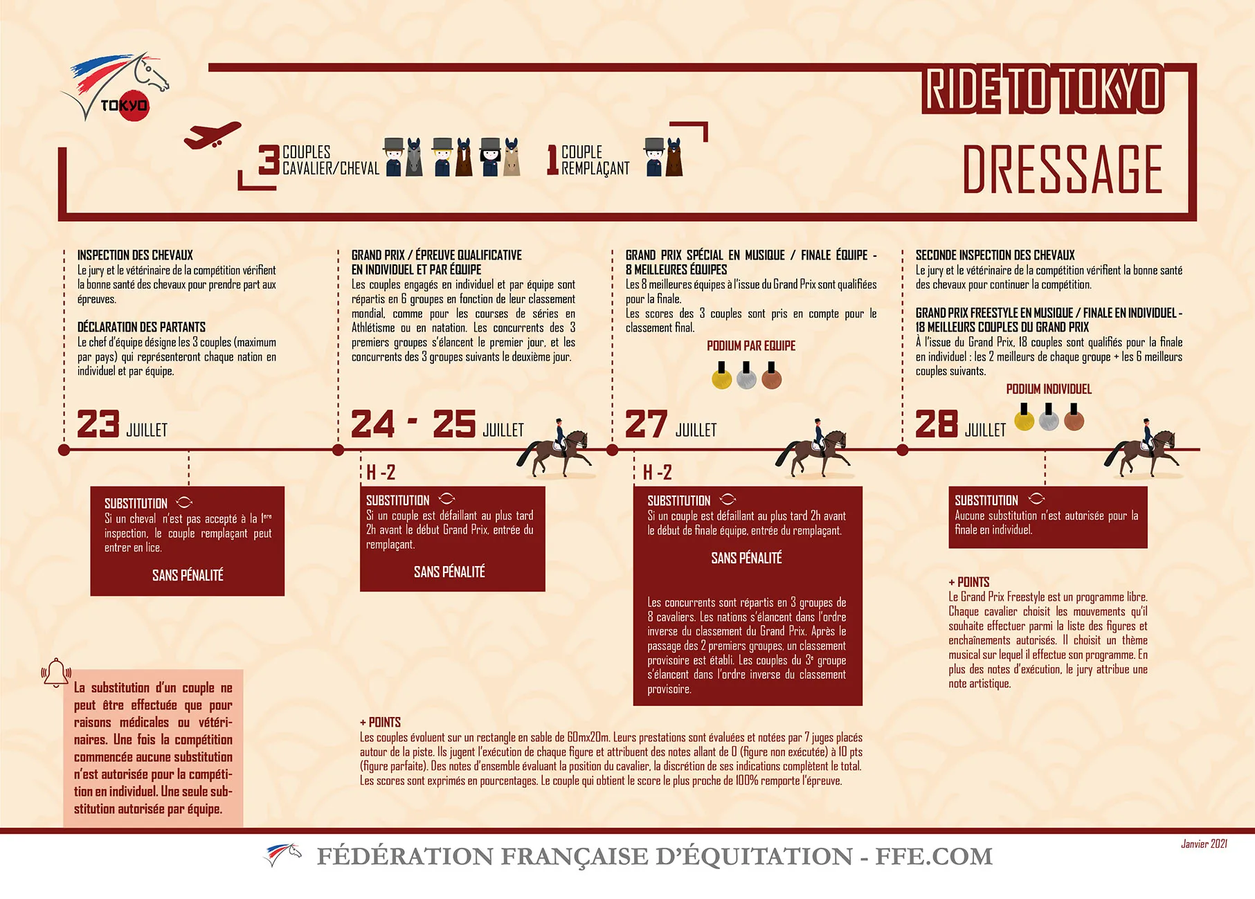 Quinze équipes de trois cavaliers et soixante chevaux au total s’élanceront pour le Grand Prix le 24 et 25 juillet prochain. Les huit meilleures équipes seront qualifiées pour le Spécial, qui déterminera les médailles collectives le 27 juillet. Pour rappel, les trois scores compteront, il n’y aura pas le système de drop score (ou score le moins bon retiré). Les cavaliers présents en individuel prendront part au Grand Prix et se qualifieront directement pour la Reprise Libre en Musique du 28 juillet, sans passer par le Spécial s’ils ne concourent qu’en individuel. Cette finale individuelle, sera ouverte aux dix-huit meilleurs duos.