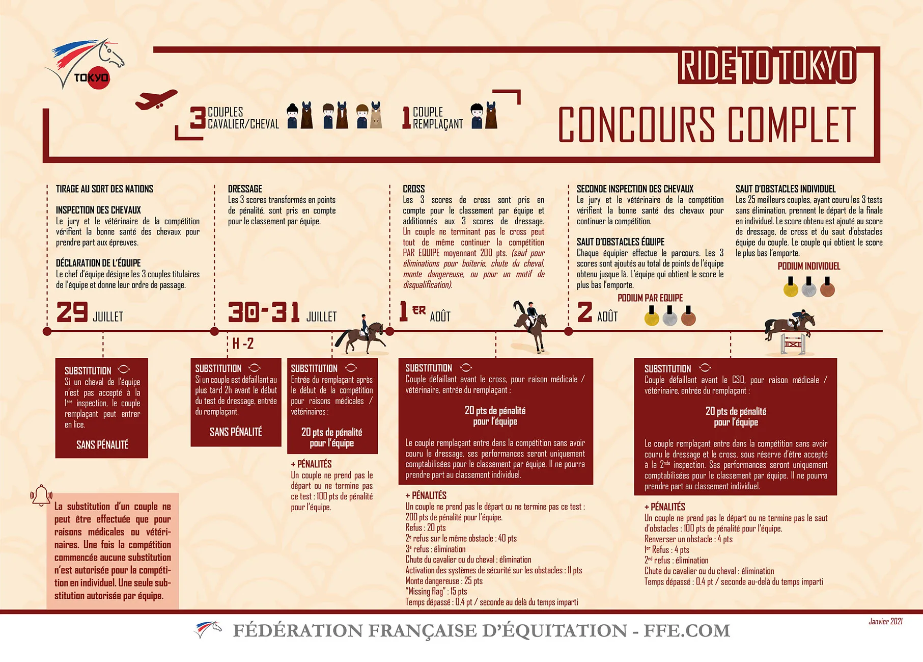 Outre la nouvelle réglementation, les conditions d’accueil des sportifs sur les lieux de l’événement ne s’annoncent pas aussi festives et réjouissantes qu’à l’accoutumée. “Cette année, les restrictions sanitaires ne nous autorisent malheureusement pas à nous réunir ou nous rendre sur les sites des autres disciplines olympiques”, regrette Michel Asseray, le directeur technique national (DTN) adjoint du concours complet.“En général, nous pouvons regarder les différentes compétitions et suivre les performances françaises depuis une télévision installée dans le village olympique. Chaque jour, le comité olympique français met des affiches pour annoncer les épreuves majeures de la journée et les médailles qui s’y jouent. Les cavaliers et le staff logeront au village olympique, dans deux appartements situés au même étage que ceux ldes autres disciplines équestres. Nous aurons à disposition un bus olympique pour nous emmener sur les deux sites équestres, la particularité de ces Jeux de Tokyo étant que le cross se déroulera sur une île à environ une heure de transports. Contrairement à d'habitude, le parcours de cross sera ouvert deux jours avant le jour de l’inscription, ce qui nous permettra d’aller le voir à l’avance. Ensuite, nous pourrons suivre et encourager l’équipe de France de dressage dont les épreuves commencent avant les nôtres.” Déjà sur place, l’équipe de France de dressage disputera en effet le premier acte de son championnat dès le 24 juillet. “Nous vivons l’aventure du dressage par petites pincées, mais pour le moment, tout le monde reste un peu dans sa bulle et concentré sur sa propre préparation”, conclut le DTN adjoint.