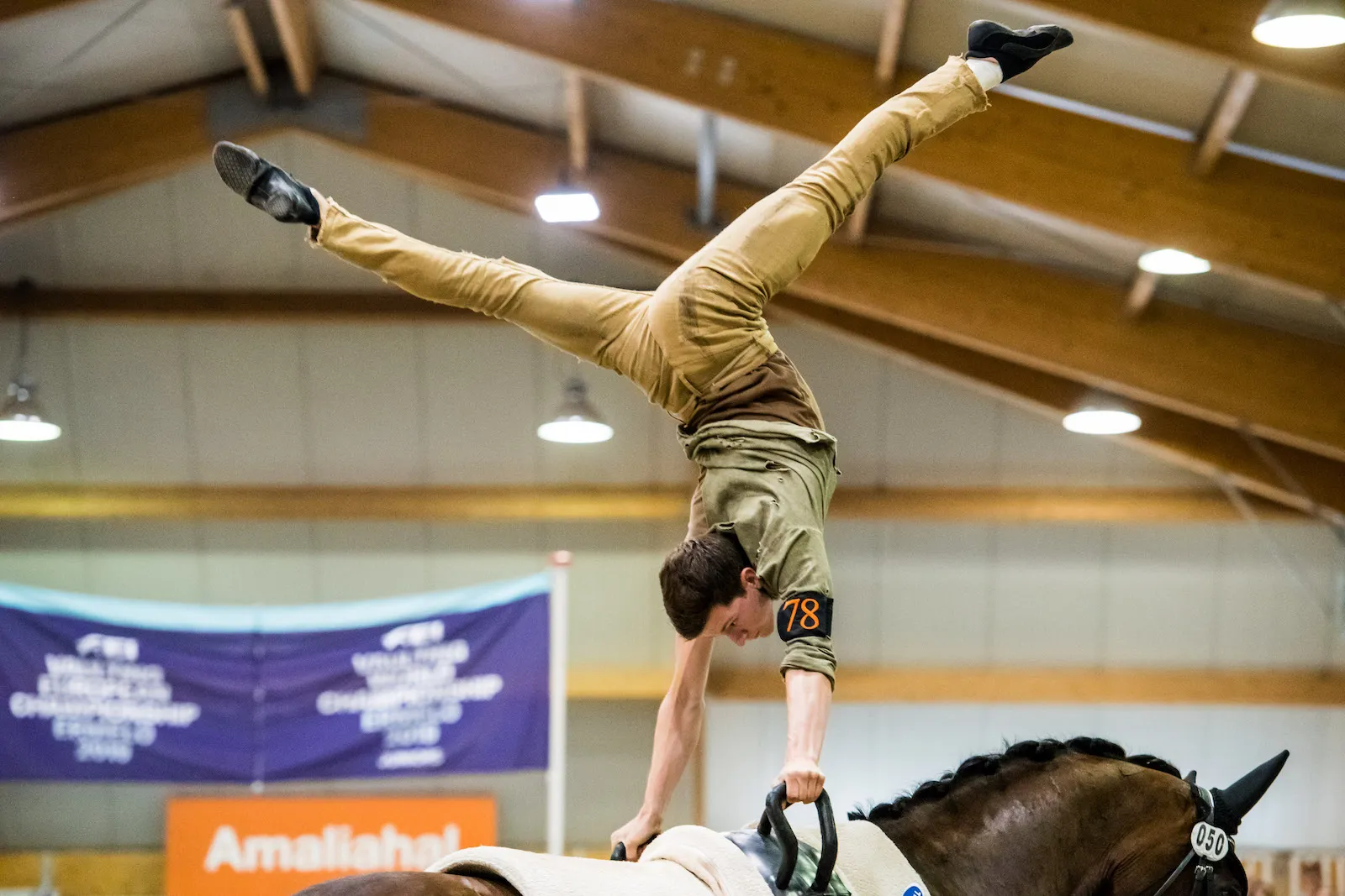 Estado est un magnifique cheval – objectivement! (rires) Il a une belle qualité de galop, ce qui est très important pour notre discipline car 25% de la note moyenne repose sur le cheval. À très haut niveau, c’est très important. Il s’est initié très facilement à la voltige. Il a entièrement confiance en moi, n’a jamais réagi ni montré de signes de résistance à ma voltige. Jamais! De plus, il est plutôt froid dans sa tête et capable de gérer beaucoup de pression si les choses sont demandées correctement et posément. Nos chevaux doivent être à l’aise avec la musique forte, les basses, les applaudissements, les tribunes qui sont souvent très proches, etc. Avec sa courte expérience, Estado a déjà su gérer certaines situations comme un cheval expérimenté.