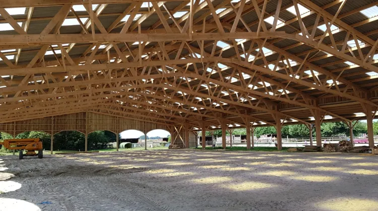 Roiné entreprise, seul intervenant du milieu équestre à offrir cette technique traditionnelle de charpentes en bois massif sur grandes largeurs, pour des manèges uniques en France.
