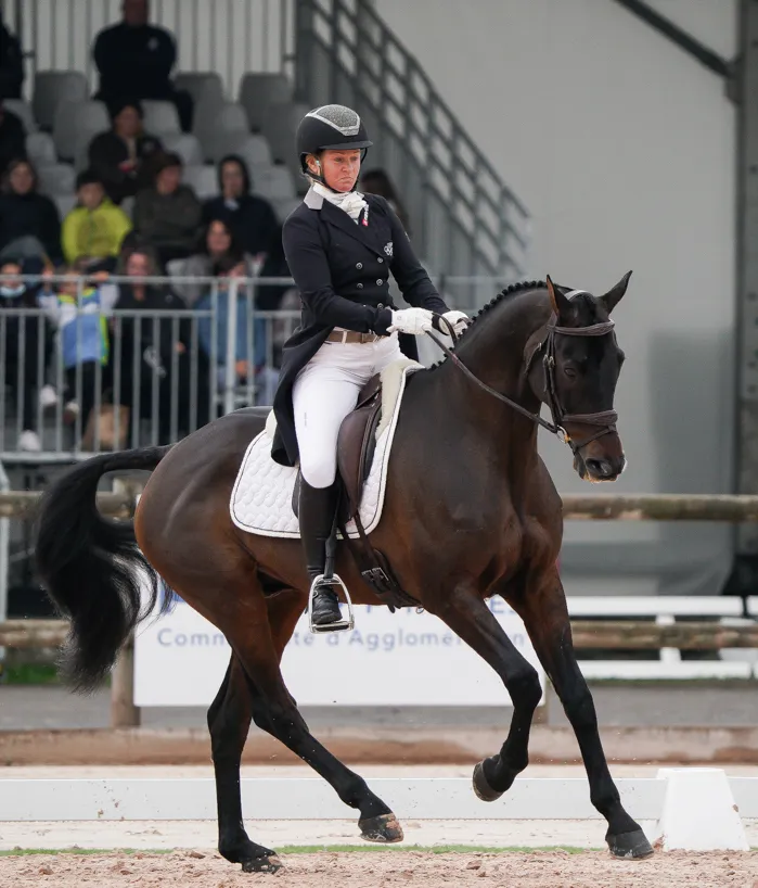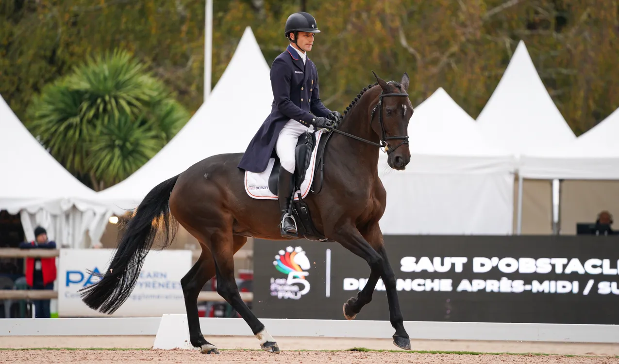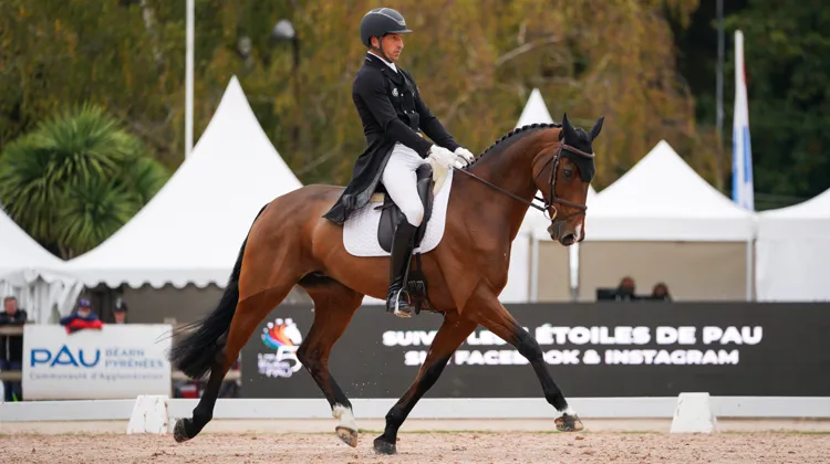 Côté Français, dans l’ensemble, les Français ont présenté de belles reprises. Mais cela n’a pas suffi pour espérer inquiéter leurs adversaires. Seul Français dans le top dix, Sidney Dufresne, premier à entrer en piste ce matin, pointe à la huitième place. Il se positionne en embuscade à moins de quatre points du podium après une très belle reprise avec sa jument Swing de Perdriat. “Swing a quinze ans maintenant”, explique le médaillé de bronze par équipes des Jeux équestres mondiaux de 2018 à Tryon. “J’ai toujours été persuadé qu’elle pouvait le faire, mais elle reste une jument difficile à gérer psychiquement. On n’a pas tout repris à zéro mais presque. Elle avait bien couru le CCIO 4*-L de Boekelo en 2017. On verra ce qui se passera d’ici à dimanche mais on ne peut être que ravi aujourd’hui. Lorsqu’elle a envie de jouer, elle est magique! Je suis content, notamment pour ses propriétaires (Iris de Fleurieu, ndlr). Elle a vécu une saison soft. Elle a suivi le Grand National, mais couru les épreuves Pro1 parce qu’il n’y avait aucune raison qu’elle présente la reprise des Jeux olympiques. Elle a passé un été tranquille et nous l’avons engagée dans le CCI 3*-S de Lignières qu’elle a vraiment bien couru. Alors nous avons dit ‘feu’ pour Pau.” De son côté, Maxime Livio est sorti satisfait du rectangle avec Vitorio du Montet, “qui a accompli d’énormes progrès sur cette discipline qui n’est pas sa favorite” est quant à lui en vingt-quatrième position. “Je suis assez content car ce n’est pas la spécialité de Vitorio. Il a réalisé d’énormes progrès. Avec trente points, je n’ai aucun regret. J’ai obtenu ce que j’espérais avoir.”