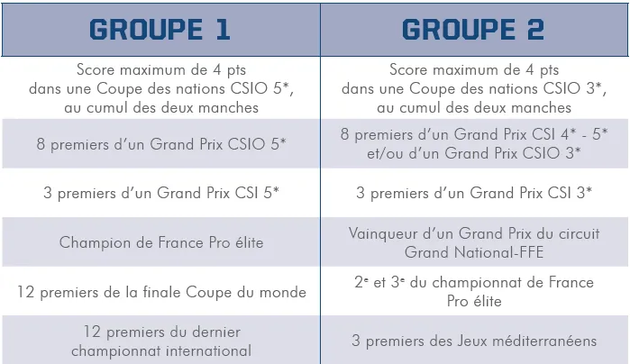 Le Groupe 1 est la référence pour les sélections des rendez-vous majeurs, notamment les championnats d’Europe et les Jeux olympiques. Le Groupe 2 permettra un suivi personnalisé des meilleurs couples en devenir et le développement du vivier Ambition 2024. Par ailleurs, la Convention JO formalisera l’engagement réciproque de la FFE avec les propriétaires de chevaux de haut niveau dans un but partagé d’ambition sportive. La signature de cette convention, qui succède à l'ancien contrat JO/JEM, conditionne l’accès d‘un couple au Groupe 1.