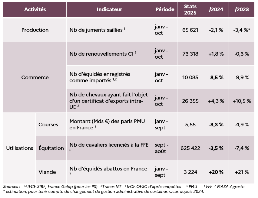 L’Observatoire économique et social du cheval (OESC) de l’Institut français du cheval et de l’équitation (IFCE) produit et diffuse régulièrement des statistiques sur la conjoncture des activités équines. Les premières tendances disponibles – provisoires car issues de données arrêtées fin octobre – font apparaître une nouvelle baisse de l’activité d’élevage en 2025. Le commerce serait reparti à la hausse sur le marché français et les exports s’annoncent en croissance. Le recul des activités se poursuivrait pour les paris hippiques comme pour l’équitation. Enfin, la hausse des abattages de chevaux se confirme en 2025.